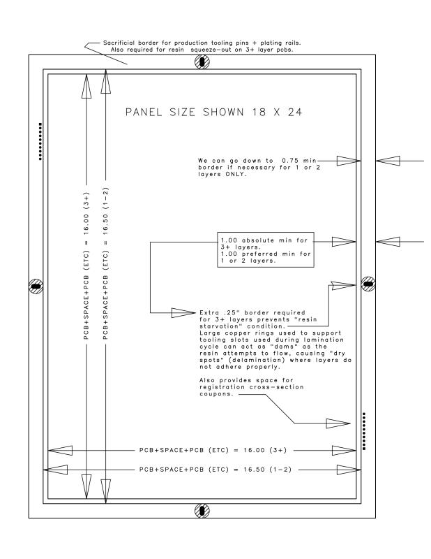 這有助于了解大多數(shù)PCB制造商在其層壓過程中使用機(jī)加工金屬板。 這些印版非常昂貴,所以制造商通常只會(huì)儲(chǔ)存一到兩種標(biāo)準(zhǔn)尺寸。 在美國(guó),目前最常見的尺寸是18x24,其中一些也采用16x21或12x18的印版。 您需要了解,無論您的制造商將向您發(fā)送的任何尺寸的PCB或子面板都必須有效地使用此尺寸的材料。