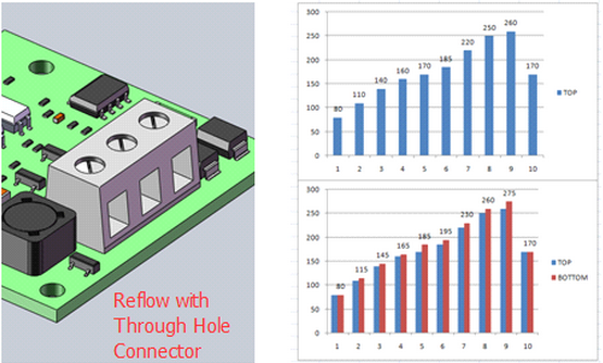 在大多數(shù)情況下,回流爐的熱設定點對于同一區(qū)域內(nèi)的頂部和底部加熱元件都是相同的。 但有些特殊情況需要對TOP和BOTTOM元件應用不同的溫度設置。 SMT工藝工程師應該檢查特定的電路板要求以確定正確的設置。 一般來說,以下是設定加熱元件溫度的一些指導原則: 如果電路板上有通孔(TH)元件,并且您想用SMT元件將它們一起回流,則可能需要考慮增加底部元件的溫度,因為TH元件會阻塞頂部的熱空氣循環(huán),從而阻止TH元件下方的焊盤接受足夠的熱量以形成良好的焊接接頭。 大多數(shù)TH連接器外殼由塑料制成,一旦溫度變得太高,塑料就會熔化。 過程工程師必須先執(zhí)行測試并檢查結(jié)果。